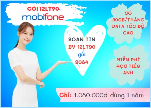 Gói cước 12LT90 MobiFone với ưu đãi hấp dẫn cộng thêm thời gian sử dụng lâu dài lên đến 12 tháng đang nhận được sự quan tâm của rất đông đảo khách hàng hiện nay. Chỉ với 1 lần đăng ký bạn được truy cập mạng cả năm mà chẳng phải lo lắng về tài khoản hay nạp tiền gia hạn gói hàng tháng. Cú pháp đăng ký gói cước cực kỳ đơn giản: BV 12LT90 gửi 9084, mỗi ngày tài khoản data của bạn sẽ nhận được 1GB tốc độ cao dung lượng 3G/4G Mobifone để truy cập theo nhu cầu.
