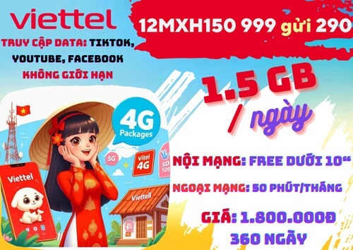Công nghệ càng phát triển đã khiến nhu cầu liên lạc và online trên di động ngày càng cao nên người dùng luôn tìm kiếm ưu đãi hấp dẫn, giá rẻ nhằm sử dụng dịch vụ thoải mái hơn với chi phí tiết kiệm hơn. Để khách hàng nhận được những lợi ích thiết thực từ dịch vụ của mình, nhà mạng Viettel đã triển khai hàng loạt gói ưu đãi hấp dẫn. Bài viết hôm nay sẽ giới thiệu đến quý khách gói cước 12MXH150 Viettel có hạn dùng 12 tháng, sở hữu combo ưu đãi khủng. Với cú pháp: 12MXH150 DB gửi 290, quý khách sẽ có cơ hội đồng hành cùng gói vụ này với mức phí 1.800.000đ.