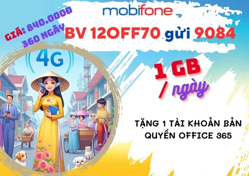 Tham gia gói cước 12OFF70 Mobifone là lựa chọn siêu tiết kiệm, rất phù hợp với những thuê bao thường xuyên kết nối tốc độ cao và sử dụng Office 365 để hỗ trợ công việc trực tuyến trong thời gian dài. Chỉ cần đủ tiền trả phí gói trong tài khoản chính hoặc không nợ cước hóa đơn tháng cuối cùng, bạn sẽ đồng hành cùng gói dịch vụ này khá dễ dàng khi gửi tin theo cú pháp: BV 12OFF70 gửi 9084. Gói cước 12OFF70 Mobifone đem lại cho người dùng combo ưu đãi lớn kèm chi phí rẻ, thoải mái sử dụng data suốt 360 ngày.