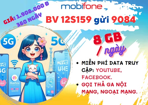 Gói cước 12S159 Mobifone là giải pháp tiết kiệm tối ưu nhà mạng dành tặng riêng những khách hàng thuộc danh sách khuyến mãi. Với 1.908.000đ và tin nhắn gửi theo cú pháp: BV 12S159 gửi 9084, bạn sẽ có cơ hội đăng ký thành công gói 5G này. Gói cước 12S159 Mobifone đem lại cho người dùng combo ưu đãi cực lớn, cho phép thuê bao thoải mái sử dụng dịch vụ liên tiếp 12 tháng. Ngoài dung lượng data để truy cập internet, thuê bao còn nhận được thời lượng gọi trong nước, kho lưu trữ MobiCloud kèm 1 năm lướt Facebook, Youtube miễn phí trên di động.