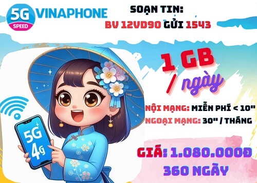 Chỉ với 1.080.000đ, bạn sẽ sở hữu gói cước 12VD90 Vinaphone với ưu đãi bùng nổ trong suốt 1 năm sử dụng: Thoại thả ga: Miễn phí tất cả các cuộc gọi nội mạng Vinaphone dưới 10 phút, không giới hạn số lượng cuộc gọi. Data “khủng”: Mỗi ngày 1GB data tốc độ cao, tổng dung lượng lên đến 360GB cho cả năm, đáp ứng mọi nhu cầu truy cập internet của bạn. Giải trí thả phanh: Miễn phí 30 phút gọi ngoại mạng mỗi tháng, cùng với các ưu đãi data miễn phí cho các ứng dụng giải trí phổ biến như TikTok, Zing MP3, YouTube,… Sử dụng linh hoạt: Gói cước có tính chu kỳ 12 tháng, tự động gia hạn sau mỗi chu kỳ. Bạn có thể dễ dàng quản lý và lựa chọn thời điểm sử dụng phù hợp với nhu cầu của mình. Đăng ký nhanh với cú pháp dưới đây: