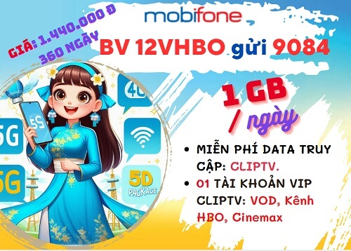 Nếu bạn muốn tiết kiệm chi phí song vẫn thoải mái học tập, làm việc và giải trí online trên di động trong thời gian dài, đừng bỏ qua gói cước 12VHBO Mobifone.Với cú pháp: BV 12VHBO gửi 9084, quý khách sẽ đồng hành cùng gói data này khá dễ dàng với mức phí bình quân tháng chỉ 120.000đ. Ưu đãi gói 12VHBO đem lại rất hấp dẫn lên đến 360GB tốc độ cao, cho phép thuê bao thoải mái kết nối mọi lúc, mọi nơi và giải trí miễn phí cùng ứng dụng ClipTV suốt 360 ngày.