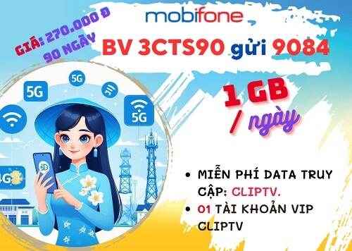 Nếu bạn thường xuyên xem phim, truyền hình trên ứng dụng ClipTV trong thời gian dài, tham gia gói cước 3CTS90 Mobifone là lựa chọn siêu tiết kiệm. Không chỉ đem lại cho người dùng cơ hội giải trí thả ga, gói ưu đãi mới này mà còn dành tặng thuê bao 90GB data để sử dụng internet liên tiếp 90 ngày. Cách đăng ký gói 3CTS90 khá đơn giản, bạn chỉ cần gửi tin theo cú pháp: BV 3CTS90 gửi 9084. Sở hữu combo ưu đãi lớn song cước gói 3CTS90 khá rẻ, chỉ 270.000đ.