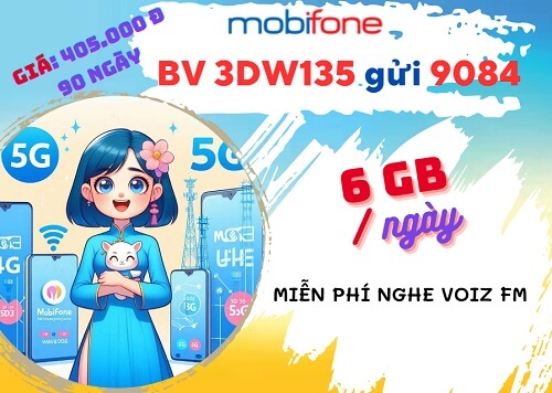 Tham gia gói cước 3DW135 Mobifone là giải pháp tiết kiệm tối ưu nếu quý khách có nhu cầu online tần suất cao trên di động trong thời gian dài. Đây là gói dịch vụ mới có chu kỳ sử dụng 3 tháng, sở hữu ưu đãi hấp dẫn. Với cú pháp: BV 3DW135 gửi 9084, bạn sẽ có cơ hội đồng hành cùng gói cước này kèm mức phí rất rẻ chỉ 405.000đ. Ngoài dung lượng data ưu đãi cực lớn hỗ trợ thuê bao tìm kiếm thông tin theo sở thích, gói cước 3DW135 còn cho phép người dùng truy cập dịch vụ Voiz FM miễn phí suốt 90 ngày.