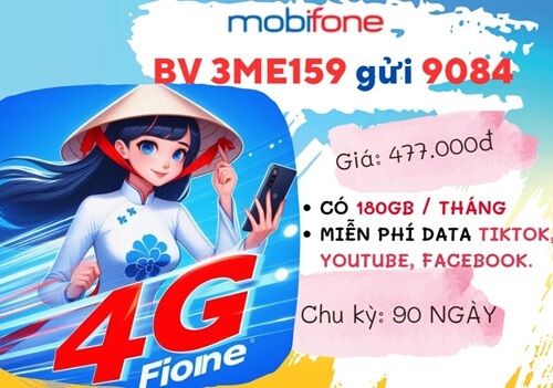 Đồng hành cùng gói cước 3ME159 Mobifone, không phải mất công nạp tiền gia hạn hàng tháng, quý khách vẫn có thể yên tâm lướt web thả ga suốt 90 ngày. Với mức phí vô cùng tiết kiệm chỉ 477.000đ kèm tin nhắn gửi theo cú pháp: BV 3ME159 gửi 9084, bạn đã có cơ hội sở hữu gói data này.