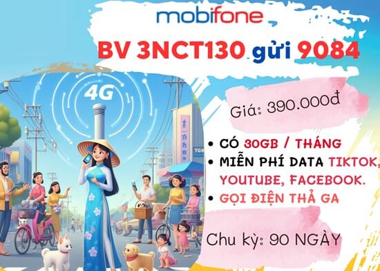 Bạn muốn “quẩy” tưng bừng mạng xã hội, “đu trend” TikTok, Facebook, YouTube mà không lo cạn data? Hay bạn muốn thoải mái gọi điện thoại cho bạn bè, người thân mà không lo về tài khoản? Vậy thì gói cước 3NCT130 MobiFone chính là dành cho bạn! Chỉ với 390.000 đồng, bạn sẽ có ngay 90 ngày sử dụng liên tục với vô vàn ưu đãi hấp dẫn: gọi nội mạng dưới 10 phút miễn phí, 30 phút gọi ngoại mạng/tháng, nhận 1 tài khoản VIP NhacCuaTui, không giới hạn data TikTok, Facebook, YouTube. Đặc biệt nhất là mỗi ngày được tặng 1GB data, lướt web bao đã luôn. Còn chần chờ gì nữa, hãy soạn tin đăng ký ngay để tận hưởng ưu đãi “khủng” này bạn nhé: BV 3NCT130 gửi 9084.