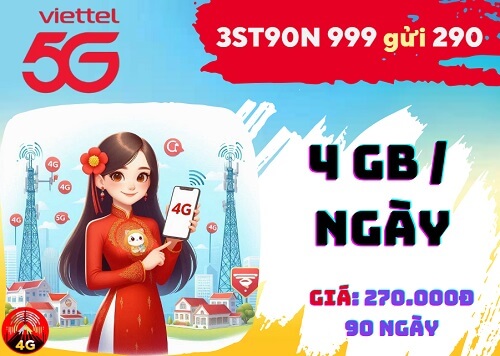 Gói cước 3ST90 Viettel chỉ 270k có ngay ưu đãi 4GB mỗi ngày, dùng 3 tháng