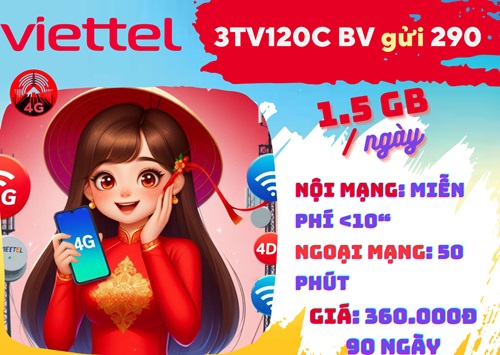 Bạn đã biết cách sở hữu ưu đãi 135GB data tốc độ cao, 3.150 phút gọi trong nước và truy cập ứng dụng TV360 miễn phí suốt 3 tháng từ gói cước 3TV120C Viettel chưa? Chỉ với 360.000đ và tin nhắn gửi theo cú pháp: 3TV120C DB gửi 290, quý khách đã có cơ hội đồng hành cùng gói ưu đãi này, thoải mái online, giải trí và liên lạc thả ga trên di động liên tiếp 90 ngày.