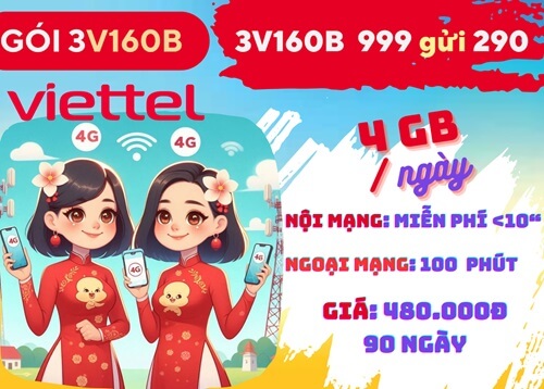 Tham gia gói cước 3V160B Viettel, quý khách sẽ được gọi di động giá rẻ và trải nghiệm công nghệ 4G của 1 trong những nhà mạng đứng đầu hiện nay. Chỉ với 480.000đ trong tài khoản chính và tin nhắn gửi theo cú pháp: 3V160B DB gửi 290, thuê bao bạn sẽ có cơ hội sở hữu gói ưu đãi này, thoải mái sử dụng dịch vụ suốt 90 ngày. Tham gia gói cước 3V160B, quý khách tha hồ truy cập các trang web mình cần với ưu đãi lên đến 360GB tốc độ cao. Ngoài ra thuê bao bạn còn được liên lạc trong nước suốt chu kỳ 3 tháng với thời lượng gọi miễn phí lên đến hàng ngàn phút.