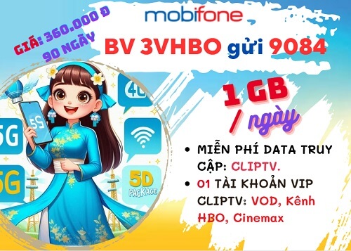 Không chỉ hỗ trợ thuê bao kết nối data theo nhu cầu suốt 3 tháng, gói cước 3VHBO Mobifone còn dành tặng người dùng cơ hội giải trí cùng ứng dụng ClipTV suốt chu kỳ. Đây là gói 4G mới vừa được triển khai trong tháng 8, có cú pháp đăng ký rất đơn giản: BV 3VHBO gửi 9084. Đủ điều kiện tham gia khuyến mãi, bạn sẽ sở hữu gói data dài kỳ này rất dễ dàng với mức phí cực kỳ ưu đãi chỉ 360.000đ.