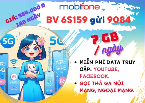 Nhằm hỗ trợ khách hàng thoải mái online, liên lạc và sử dụng tiện ích trên di động trong thời gian dài, nhà mạng đã triển khai hàng loạt gói ưu đãi hấp dẫn và gói cước 6S159 Mobifone đã được không ít người dùng ưa chuộng. Gửi tin theo cú pháp: BV 6S159 gửi 9084, bạn sẽ có cơ hội sở hữu gói dịch vụ này với mức phí 954.000đ. Gói cước 6S159 Mobifone đem lại cho thuê bao combo ưu đãi cực lớn, tích hợp thoại, data và nhiều tiện ích hấp dẫn. Đăng ký gói thành công, quý khách thoải mái online, liên lạc, lưu trữ và lướt Facebook, Youtube thả ga trên di động liên tiếp 180 ngày.