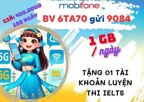 Với mức phí bình quân tháng chỉ 70.000đ, gói cước 6TA70 Mobifone sẽ đem lại cho quý khách 6 tháng sử dụng data và ôn học, luyện thi tiếng Anh trên hệ sinh thái MobiEdu. Gói 4G dài kỳ này được triển khai cho khách hàng di động mới và thuê bao đang hoạt động hai chiều thuộc danh sách khuyến mãi. Gửi tin theo cú pháp: BV 6TA70 gửi 9084, bạn sẽ có cơ hội sở hữu ưu đãi hấp dẫn từ gói data này.