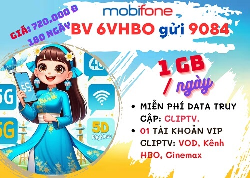 Bạn sẽ có 6 tháng sử dụng internet tốc độ cao và xem phim, truyền hình thả ga khi tham gia gói cước 6VHBO Mobifone. Cách nhận ưu đãi gói 4G này rất đơn giản, bạn chỉ cần đảm bảo đủ 360.000đ trong tài khoản gốc và gửi tin nhắn theo cú pháp: BV 6VHBO gửi 9084. Ưu đãi gói cước 6VHBO đem lại khá lớn kèm phí dịch vụ rẻ, cho phép thuê bao thoải mái online và giải trí tốc độ cao suốt 180 ngày.