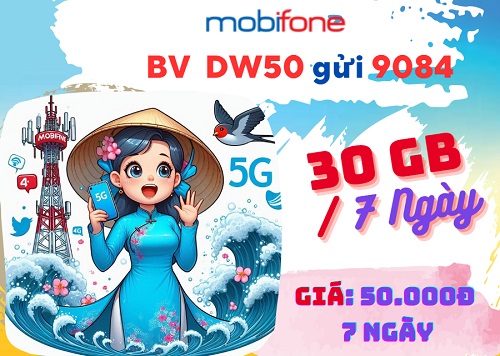 Chỉ 50.000đ, gói cước DW50 Mobifone sẽ đem lại cho quý khách 7 ngày thoải mái sử dụng data trên động với ưu đãi lên đến 30Gb tốc độ cao. Không cần phải đáp ứng bất kỳ điều kiện nào về đối tượng ưu đãi, quý khách vẫn có thể sở hữu gói data tuần này rất dễ dàng khi gửi tin theo cú pháp: BV DW50 gửi 9084. DW50 Mobifone là gói dịch vụ mới ưu đãi data tích hợp tiện ích hấp dẫn, hỗ trợ người dùng khám phá kho tàng sách nói suốt chu kỳ.