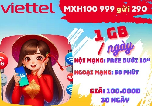 - Miễn phí 1GB data tốc độ cao mỗi ngày, liên tiếp 90 ngày (gói 3MXH100), 180 ngày (gói 6MXH100), hoặc 360 ngày (gói 12MXH100).