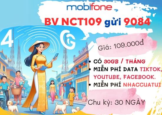 Bạn là tín đồ của TikTok, Facebook, YouTube? Bạn đam mê âm nhạc và muốn tận hưởng những bản hit mới nhất? Vậy thì đừng bỏ lỡ gói cước NCT109 siêu ưu đãi đến từ MobiFone! Với mức giá chỉ 109.000 đồng/30 ngày, bạn đã có thể tận hưởng vô vàn ưu đãi hấp dẫn, bao gồm: miễn phí 1 tài khoản VIP NhacCuaTui, không giới hạn data truy cập TikTok, Facebook, YouTube và cung cấp dung lượng data lên tới 1GB/ngày. Hãy nhanh tay đăng ký gói cước NCT109 Mobifone ngay hôm nay để trải nghiệm những ưu đãi tuyệt vời này nhé: BV NCT109 gửi 9084.