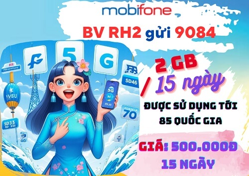 Chỉ với 500.000đ, gói cước RH2 Mobifone sẽ đem lại cho quý khách 15 ngày thoải mái online khi du lịch hay công tác tại nước ngoài. Với cú pháp: BV RH2 gửi 9084, bạn sẽ nhanh chóng đồng hành cùng gói dịch vụ CVQT này. Ưu đãi từ gói cước RH2 sẽ hỗ trợ thuê bao khám phá tất cả các trang mạng mình cần mà không phải lo lắng phát sinh cước 4G/5G đắt đỏ.