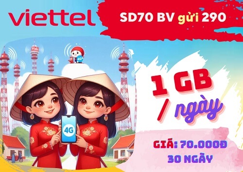 Nếu quý khách đang tìm kiếm ưu đãi tầm 1GB mỗi ngày nhằm hỗ trợ cho học tập, công việc và giải trí online trên di động, gói cước SD70 Viettel hứa hẹn sẽ đáp ứng tốt nhu cầu này của bạn với mức phí vô cùng tiết kiệm. Chỉ cần là khách hàng mới, đăng ký hòa mạng từ 1/1/2023 trở về sau, quý khách sẽ sở hữu gói 4G này rất dễ dàng khi gửi tin theo cú pháp: SD70 DB gửi 290. Gói cước SD70 đem lại cho người dùng dung lượng data ưu đãi khá lớn, lên đến 30GB tốc độ cao, hỗ trợ thuê bao khám phá tất cả các tiện ích internet suốt 30 ngày với mức phí rất rẻ chỉ 70.000đ.