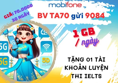 Tham gia ưu đãi gói cước TA70 Mobifone là lựa chọn siêu tiết kiệm hỗ trợ thuê bao tự tin online và học tiếng Anh không giới hạn ngay trên thiết bị di động mỗi ngày. Để sở hữu ưu đãi hấp dẫn từ gói 4G này, bạn chỉ cần gửi tin theo cú pháp: BV TA70 gửi 9084. Dung lượng data gói cước TA70 hỗ trợ kết nối theo nhu cầu khá lớn, lên đến 30GB tốc độ cao và không giới hạn data sử dụng tiện ích kèm phí gói siêu rẻ chỉ 70.000đ.