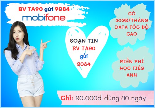 Không chỉ ưu đãi 30GB hỗ trợ kết nối theo nhu cầu, gói cước TA90 Mobifone còn miễn phí hoàn toàn dung lượng tốc độ cao khi thuê bao ôn luyện tiếng Anh trên hệ sinh thái MobiEdu suốt cả tháng. Đủ điều kiện tham gia khuyến mãi, bạn sẽ nhận ưu đãi gói 4G này rất dễ dàng khi gửi tin theo cú pháp: BV TA90 gửi 9084. Ngoài đem lại combo ưu đãi cực lớn, cước dịch vụ gói TA90 cũng khá rẻ, chỉ 90.000đ.