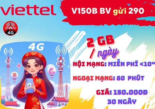 Sở hữu gói cước V150B Viettel thành công, quý khách sẽ được đồng hành cùng combo ưu đãi hấp dẫn gồm: 60GB data, 80 phút gọi ngoài mạng và tất cả các cuộc gọi nội mạng dưới 10 phút. Chỉ với 150.000đ trong tài khoản chính và tin nhắn gửi theo cú pháp: V150B DY gửi 290, bạn sẽ có cơ hội nhận được 30 ngày thoải mái online và gọi thả ga trên di động.